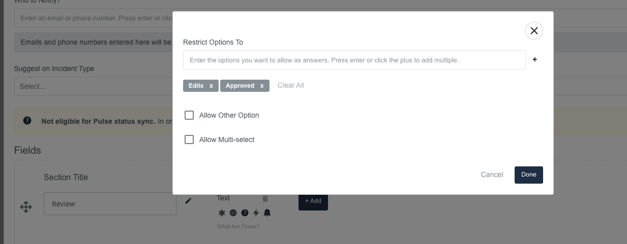 TEXT field with a set of options.You can set your form to target certain call types with the suggest on incident type dropdown on the form configuration, or by clicking the require on important incidents toggle.